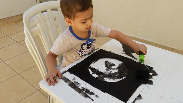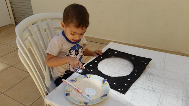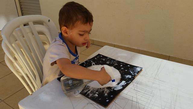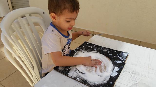 3º) Davi Antonios pegou a escova de dente com a tinta guache branco para pingar como estrelas;