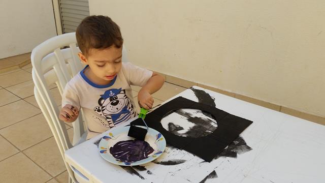 2º) Davi Antonios pintou com a tinta guache preto com rolo de espuma e depois com a tinta guache roxo;