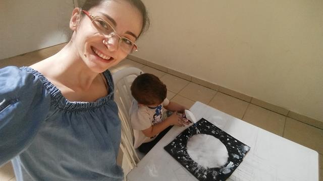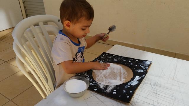 Ahhh! Gente! Olha só que atividade gracinha!! Eu sou suspeita em falar, sou apaixonada por atividades criadas com sucatas e recicláveis!!! Olhar para o céu e ver a Lua é a melhor e última imagem antes de ir dormir. Porque durante o sono ela está ali iluminando, clareando... Materiais: Papelão, rolo de espuma, tintas guaches preto, roxo e branco, escova de dente, sal, colher de sopa e borrifador (água). Segue o passo a passo da nossa atividade: