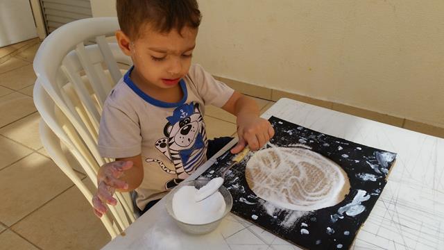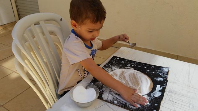 4º) Colei com cola quente em cima do papelão para o Davi Antonios colocar o sal no meio com o uso da colher de sopa;