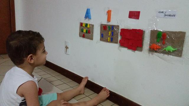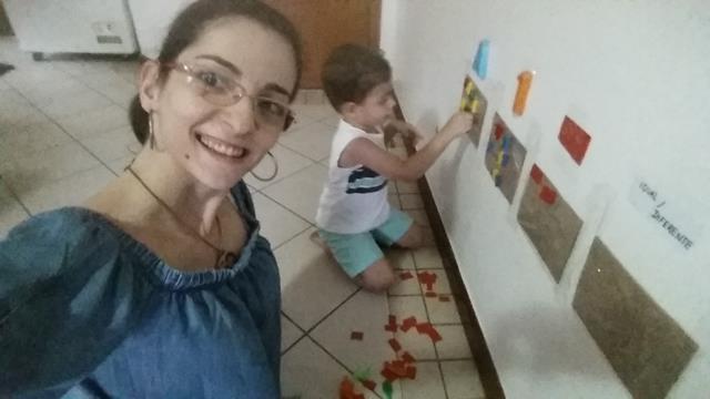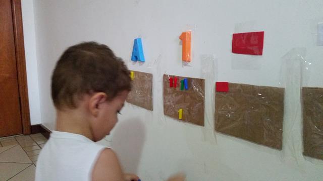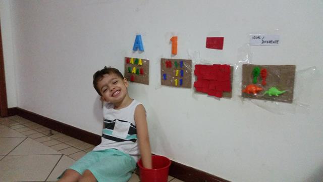 Hoje foi o dia de trabalhar a vogal A, número 1, cor vermelha e igual/diferente com uma atividade bem lúdica. É muito simples, só utilizamos fita crepe e papelão.