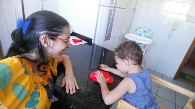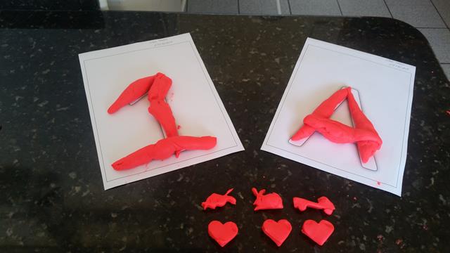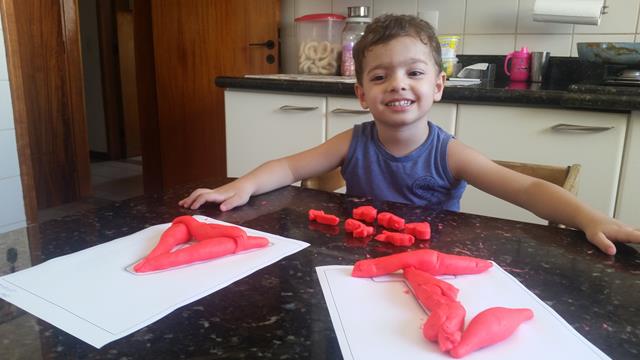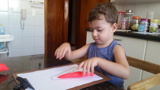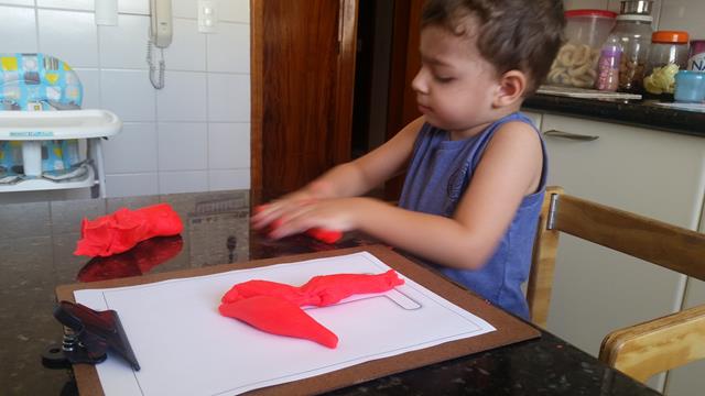 O primeiro objetivo desta atividade é o contorno da vogal A e número 1 com massinha, não pensei 2 vezes é lógico que Davi Antonios adorou e arrasou ?? Ele foi fazendo "cobrinhas" com a massa, e depois preenchendo a vogal A e número 1 no papel. E o segundo objetivo: separei as pecinhas em forma de caminhão, peixe, coração e coelho e pedi que ele encaixasse com a massinha para identificar o que são iguais e diferentes.