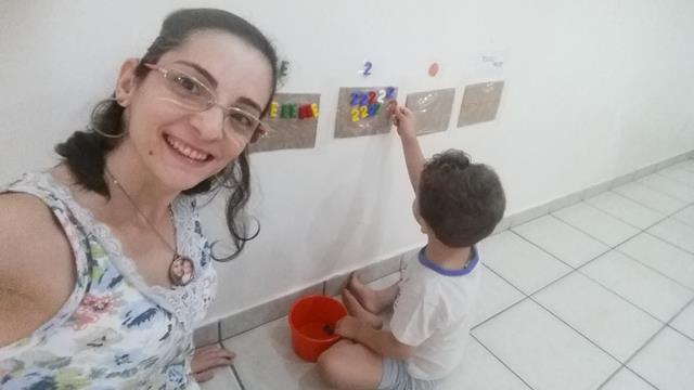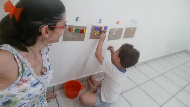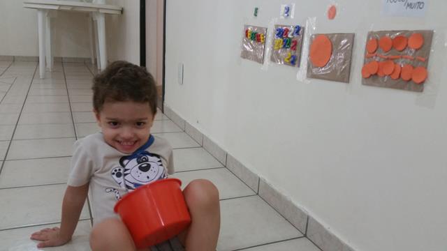 Hoje foi o dia de trabalhar a vogal E, número 2, cor laranja e pouco/muito com uma atividade bem lúdica. É muito simples, só utilizamos fita crepe e papelão.