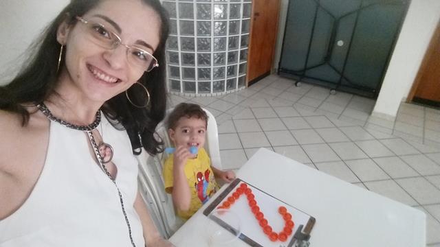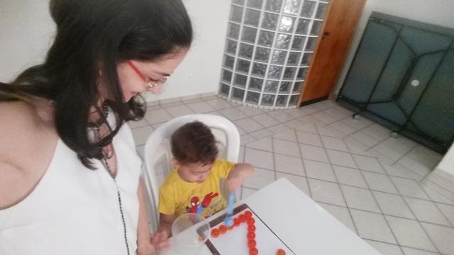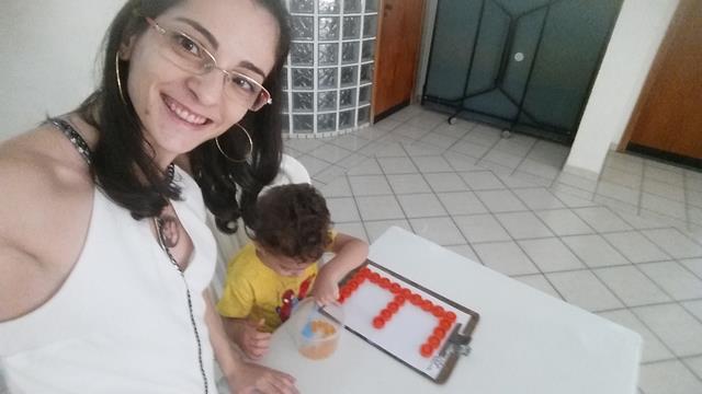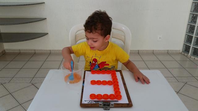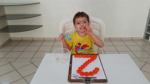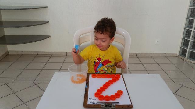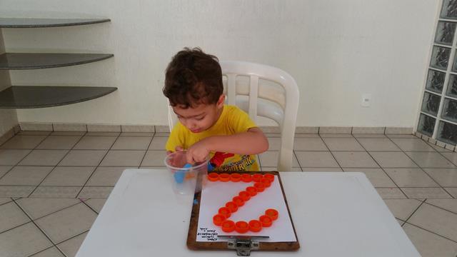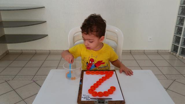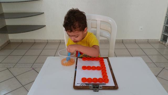 Montei a vogal E e número 2 com tampinhas de garrafa Pet. Davi Antonios fez transferência de bolinhas de gel com colher medidora de leite. Mamãe pediu para o Davi Antonios colocar três bolas (papel EVA) e outras nove bolas para identificar o que são pouco e muito.