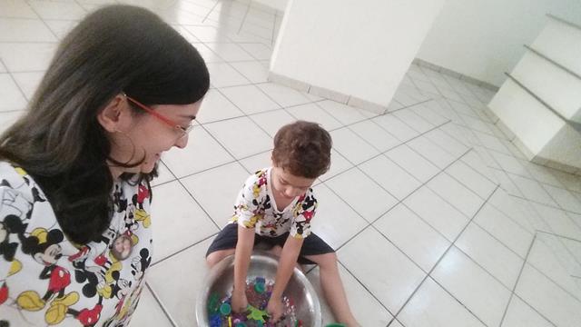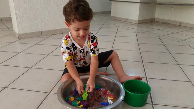 O objetivo desta atividade é caçar as letrinhas, números, cor verde (tampinhas de garrafa pet), pequeno e grande (papel EVA - coração) com o uso da tesoura bola.