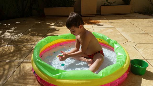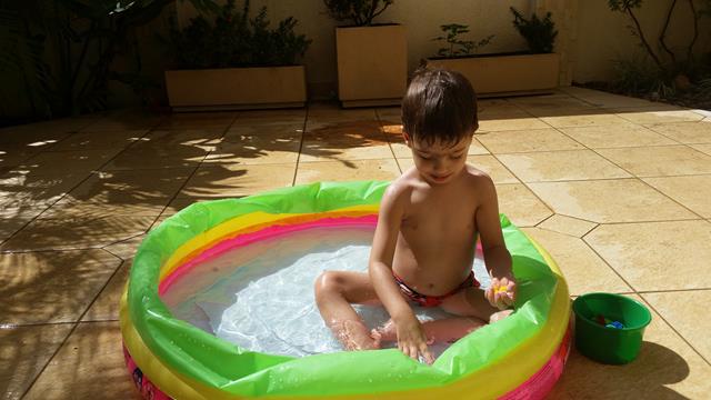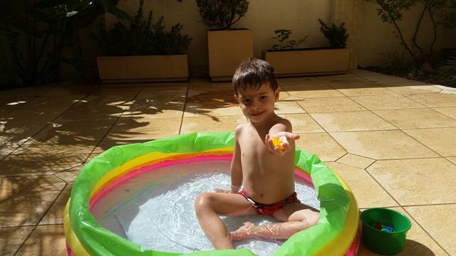 Davi ajudando a mamãe a encher a água da piscina.