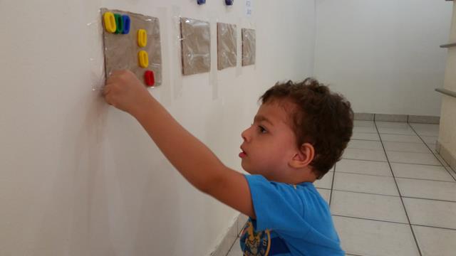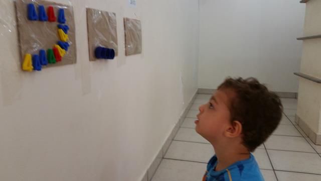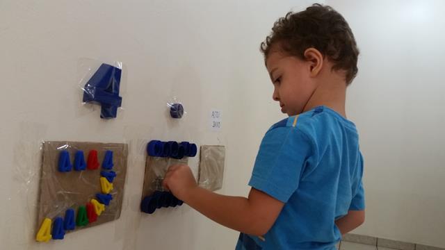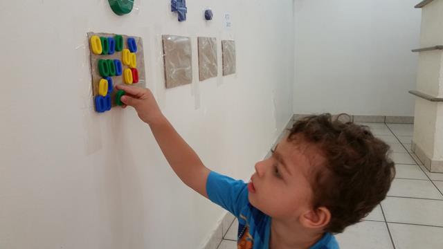 O objetivo desta atividade é colocar cada letrinha, cada número, cor azul e identificar o que é alto e baixo (papel EVA) no seu lugar. Trabalhamos foco, concentração, atenção, percepção visual e coordenação motora.
