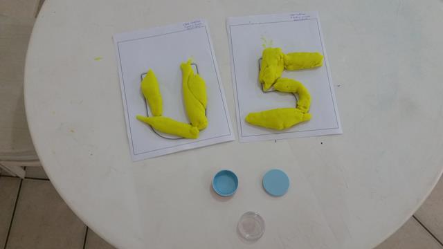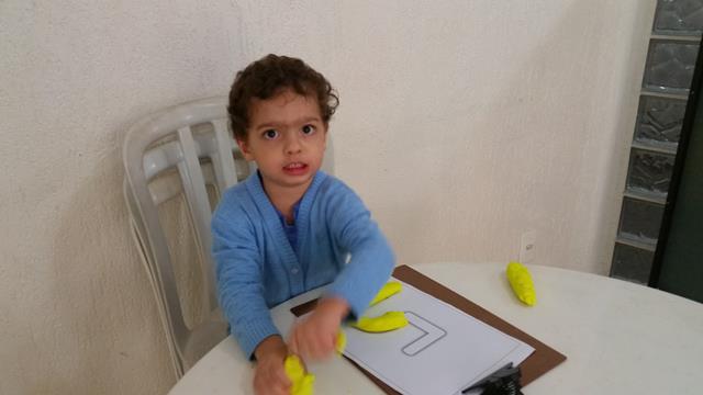 O primeiro objetivo desta atividade é o contorno da vogal U e número 5 com massinha, não pensei 2 vezes é lógico que Davi Antonios adorou e arrasou ?? Ele foi fazendo "cobrinhas" com a massa, e depois preenchendo a vogal U e número 5 no papel. E o segundo objetivo: perguntei para ele como abre e fecha.