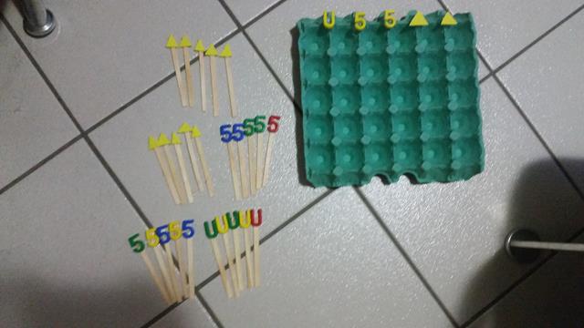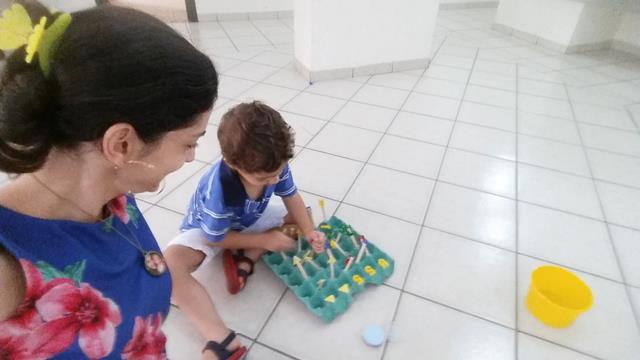 O objetivo desta atividade é furar a cartela de ovo para o Davi Antonios encaixar no lugar certo as letrinhas, números, cor amarela (papel EVA) e identificar o que é aberto e fechado.