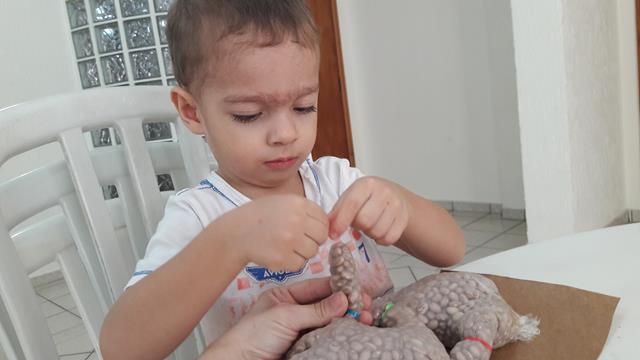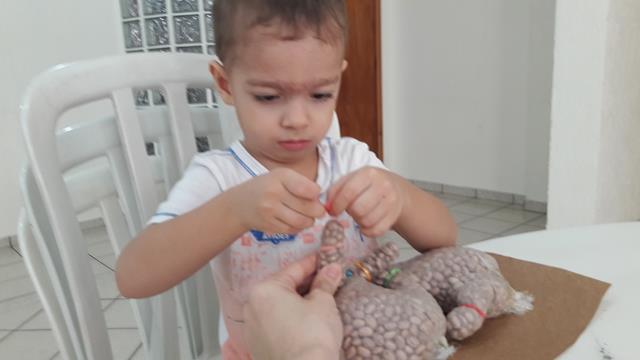 Sempre que Davi Antonios está agitado faço atividade com ele. Normalmente a concentração exigida acalma. É bem simples de fazer, basta uma luva de látex transparente, feijão e liguinhas. O objetivo é abrir a liguinha para colocar no dedinho. Fortalecimento dos dedos para abrir a liguinha é colocar no dedinho. Trabalha o planejamento motor, olho-mão, e atividade integração bilateral. Um excelente exercício de motricidade fina. A mamãe teve segurar a mão, pois estava toda moleza rsrsrsrs Enfim, Davi Antonios não teve dificuldade e conseguiu! Que orgulho da mamãe, meu príncipe! Davi Antonios gostou desta atividade. #maeemdia #brincarjunto #tempojunto #maternidadereal #maternidadeativaeconsciente #educandocomamor #DaviAntonioscom2anose7meses
