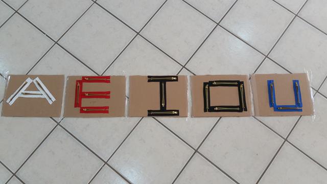 A mamãe colou zíper em forma de A, E, I, O, U e colou com cola quente no papelão.