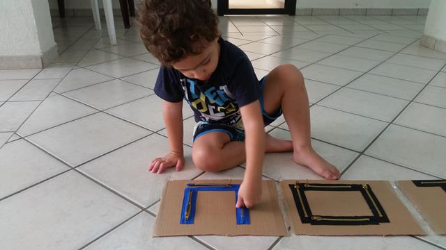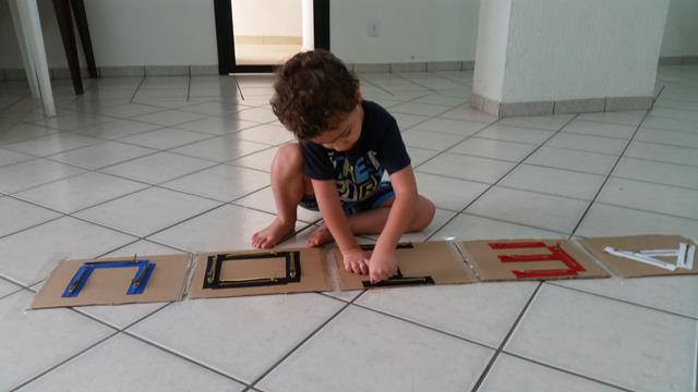 O objetivo da atividade é abrir e fechar zíper sobre letra escrita no papelão.