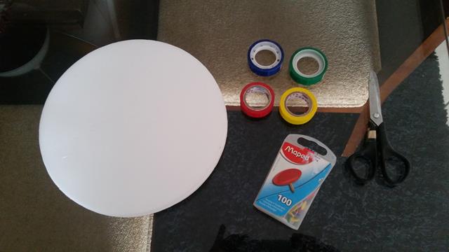 Usando disco de isopor para pizzas congeladas, fita adesiva colorida e canetinha preta, é possível criar lindas vogais. A mamãe fez o corte da fita adesiva colorida em forma de A, E, I, O, U no disco de isopor. Depois, fez o pontinho da canetinha preta na fita adesiva colorida.
