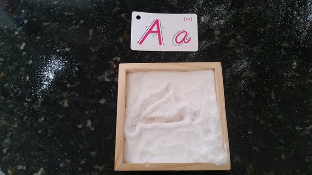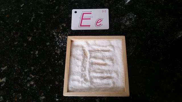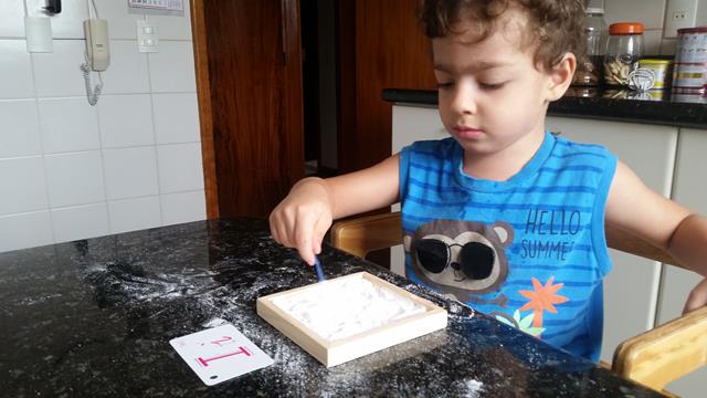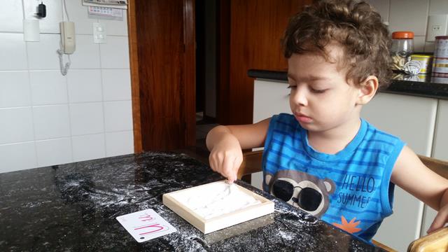 Os desenhos do sal de cozinha não precisam ser perfeitamente iguais aos dos cartões: O IMPORTANTE AQUI É A CRIANÇA SE FAMILIARIZAR COM O ALFABETO DE FORMA FÍSICA. Ele gostou muito. #maeemdia #brincarjunto #tempojunto #maternidadereal #maternidadeativaeconsciente #educandocomamor #DaviAntonioscom3anose4meses