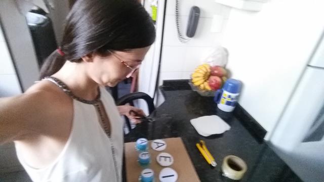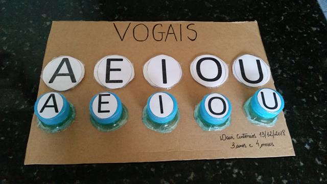 A mamãe imprimiu a sequência de vogais num papel A4 de A, E, I, O e U e encapou com fita adesiva (pra durar mais) na tampa de água com papelão.