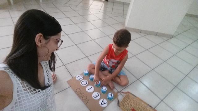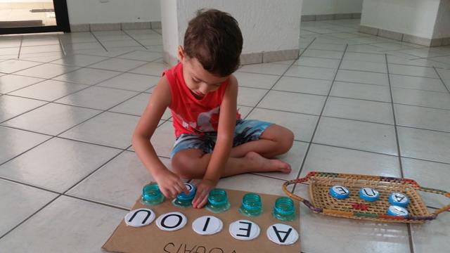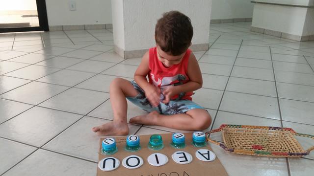 O objetivo da atividade é fechar a tampa de acordo com os cartões das vogais.