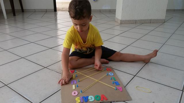 Davi Antonios foi fazendo o pareamento de vogais de A, E, I, O e U utilizando ligas! Uma atividade simples e divertida! Ele amou! #maeemdia #brincarjunto #tempojunto #maternidadereal #maternidadeativaeconsciente #educandocomamor #DaviAntonioscom3anose4meses