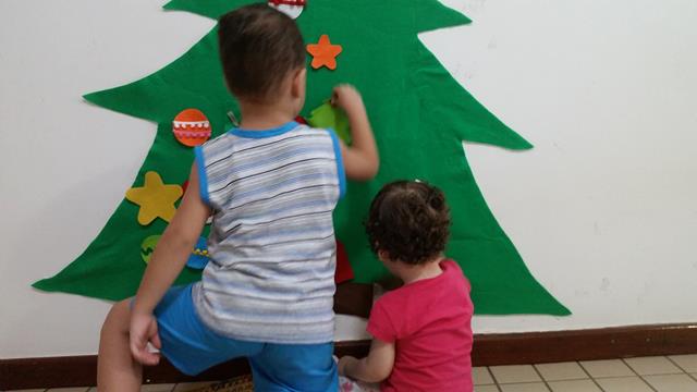ÁRVORE DE NATAL MONTESSORI DE FELTRO: Nossa árvore de Natal Montessori acompanha Davi Antonios desde o segundo ano e esperamos ainda tê-la em casa mais um ano. Essa é a parte que mais gosto de nossa árvore de Natal Montessori. Está ao alcance da criança que pode tocá-la, tirar e colocar os enfeites como quiser. É uma árvore que muda conforme o gosto da criança e isso lhe dá autonomia para criar e recriar com os símbolos natalinos.