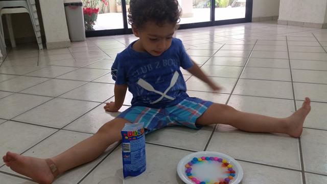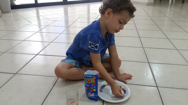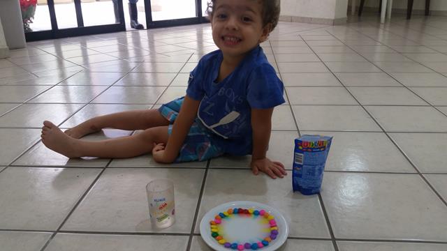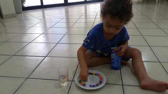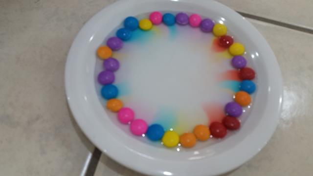 O objetivo da atividade é só espalhar as balas na borda do prato e colocar água. O corante e o açúcar vão se dissolver na água e se espalhar pelo prato.