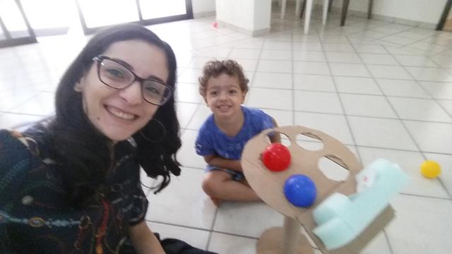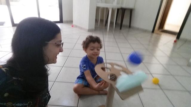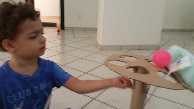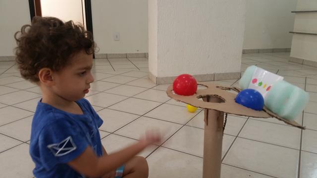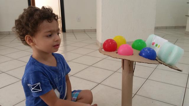 Nessa atividade, o bacana é bater com a colher nas bolas seguindo a sequência de cores do cartão.