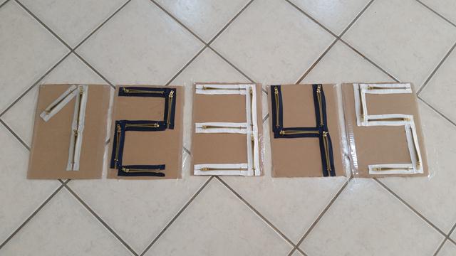 A mamãe colou zíper em números de 1, 2, 3 4, 5 e colou com cola quente no papelão.