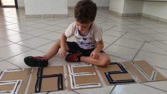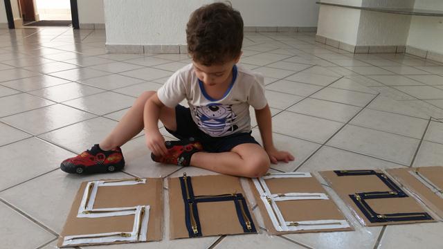 O objetivo da atividade é abrir e fechar zíper sobre número no papelão.