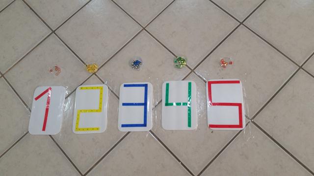 O objetivo da atividade é colocar os percevejos no pontinho da canetinha preta sobre números no disco de isopor da cor correspondente.