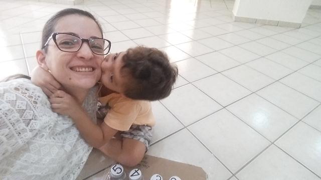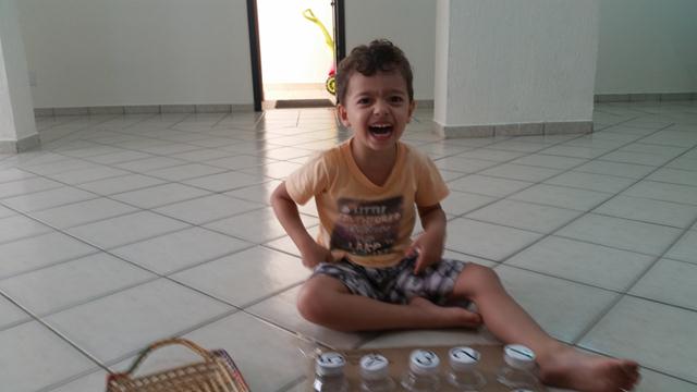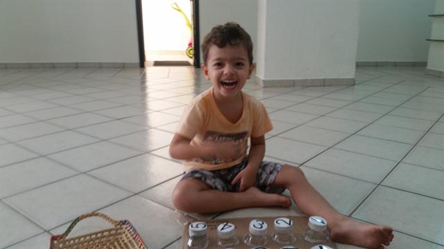 A mamãe imprimiu a sequência de números num papel A4 de 1, 2, 3, 4 e 5 e encapou com fita adesiva (pra durar mais) na tampa de amaciante com papelão.