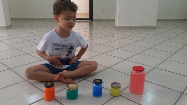 A mamãe utilizou 5 potes com água e colocou tinta em cada tampa das cores VERMELHO, AMARELO, AZUL, VERDE e LARANJA.