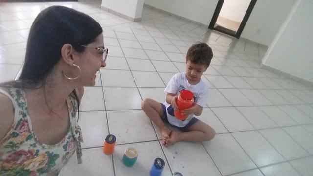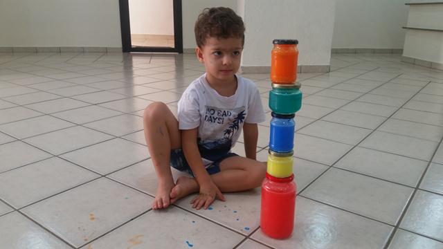 Davi Antonios adora uma surpresa. Chacoalhou, falou direitinho das cores, enfileirou, tentou abrir os potes, contou um por um e ainda por cima os empilhou! Muito bagunceiro essse príncipe!