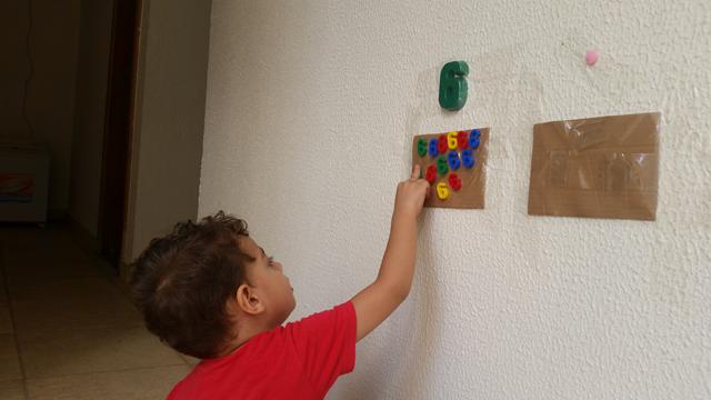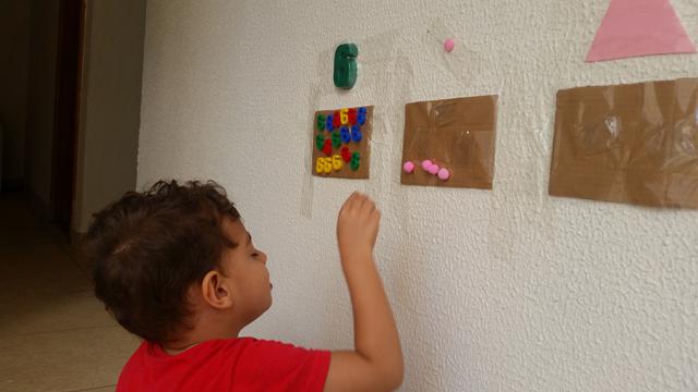 Hoje foi o dia de trabalhar o número 6, cor rosa, forma geométrica triângulo e perto/longe com uma atividade bem lúdica. É muito simples, só utilizamos fita crepe e papelão.