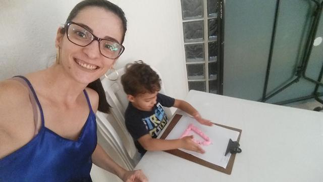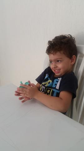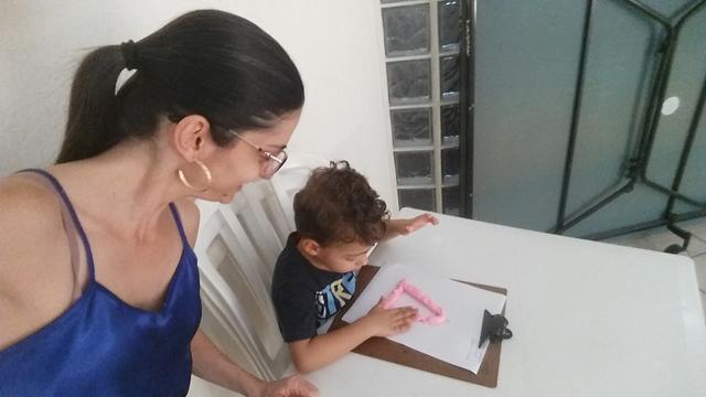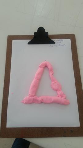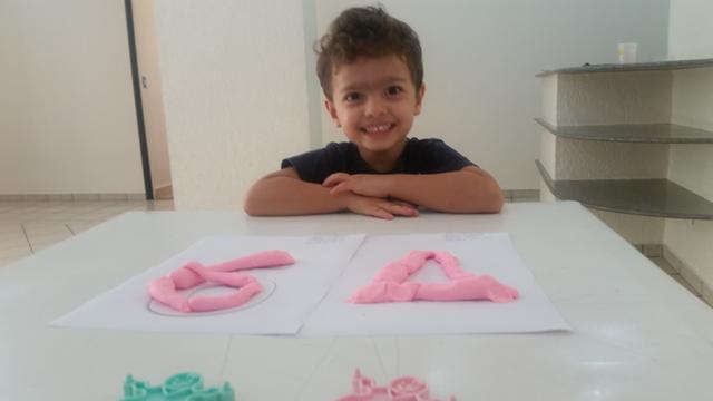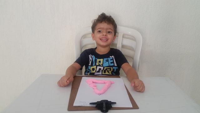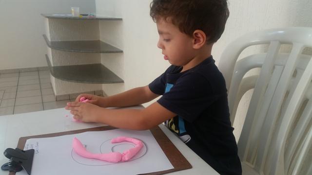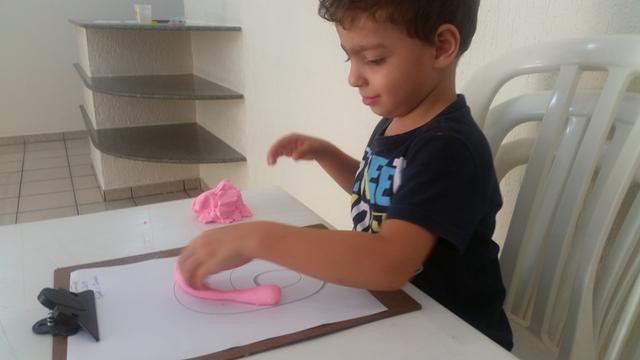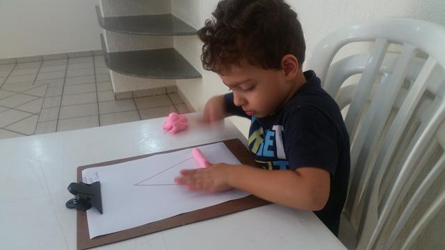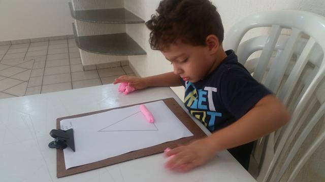 O primeiro objetivo desta atividade é o contorno do número 6 com massinha, não pensei 2 vezes é lógico que Davi Antonios adorou e arrasou ?? Ele foi fazendo "cobrinhas" com a massa, e depois preenchendo a forma geométrica triângulo no papel. E o segundo objetivo: pedi para ele identificar o que é perto e longe (brinquedo de boneco).