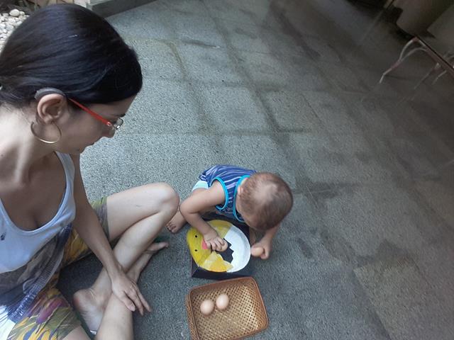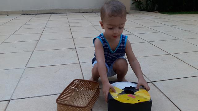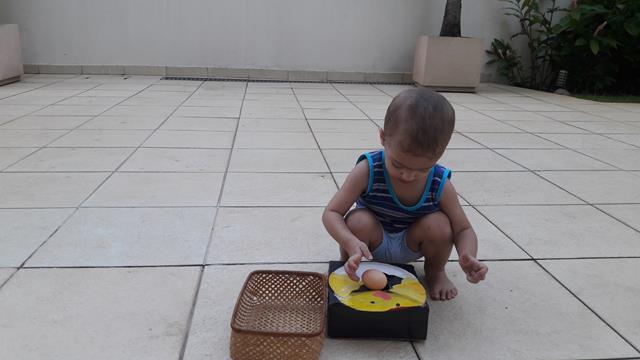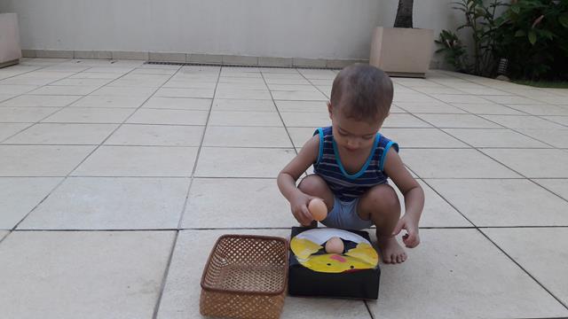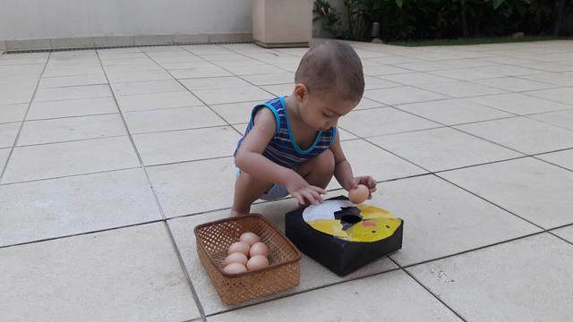 No final da atividade, o Davi respondeu: "Mamã, bou o ouo". (Mamãe, acabou o ovo.)
