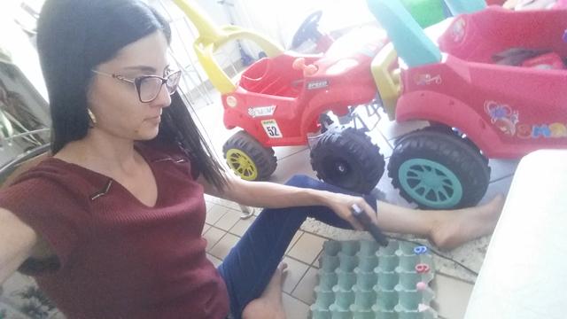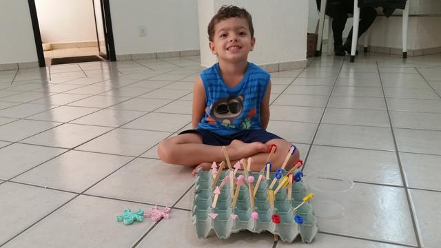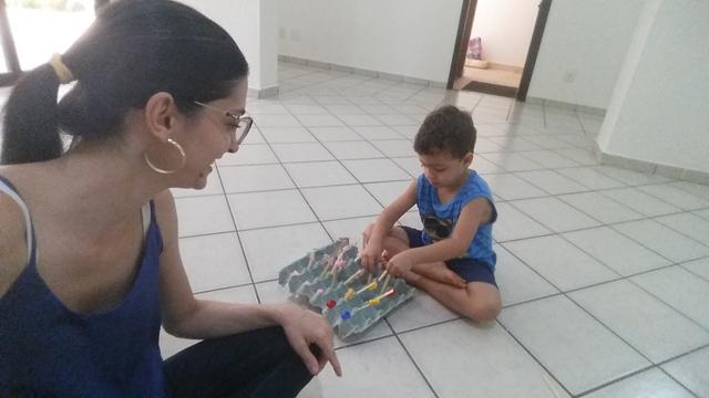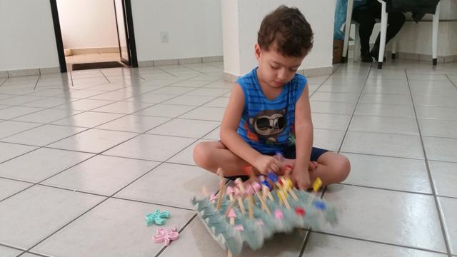 O objetivo desta atividade é furar a cartela de ovo para o Davi Antonios encaixar no lugar certo os números, cor rosa (pompom) e forma geométrica triângulo (papel EVA) e identificar o que é perto e longe (brinquedo de boneco).