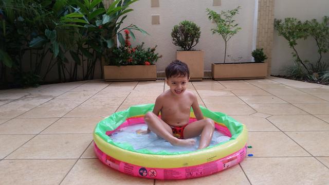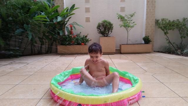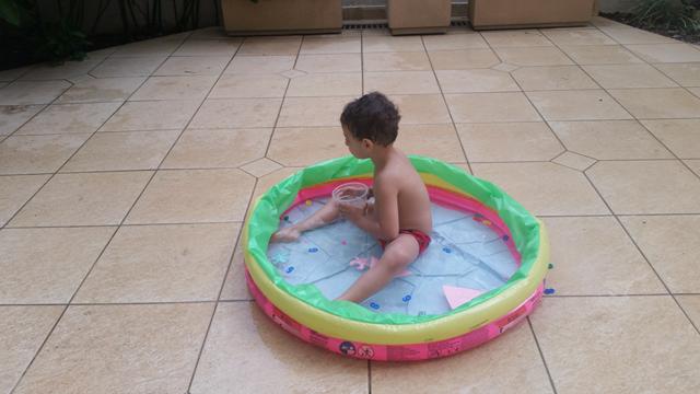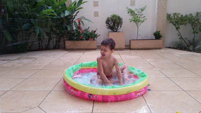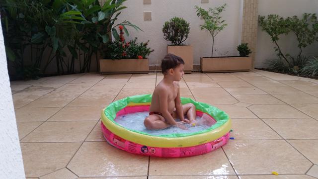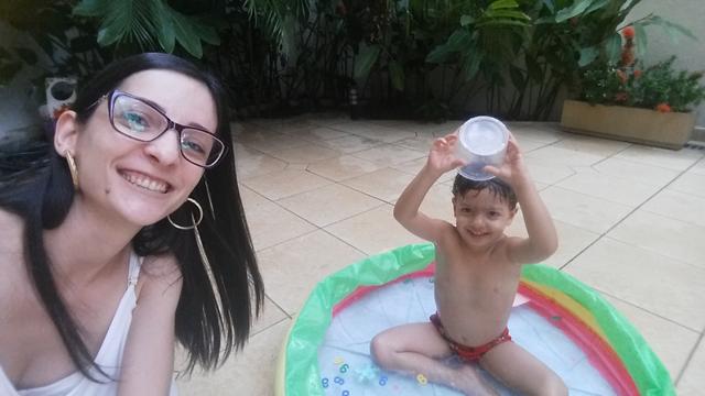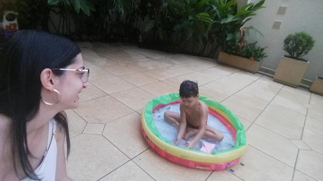 Tendo como objetivo o reconhecimento e ouvir a mamãe falar para procurar os números, cor rosa (pompom), forma geométrica triângulo (papel EVA) e identificar o que é perto e longe (brinquedo de boneco) na piscina.