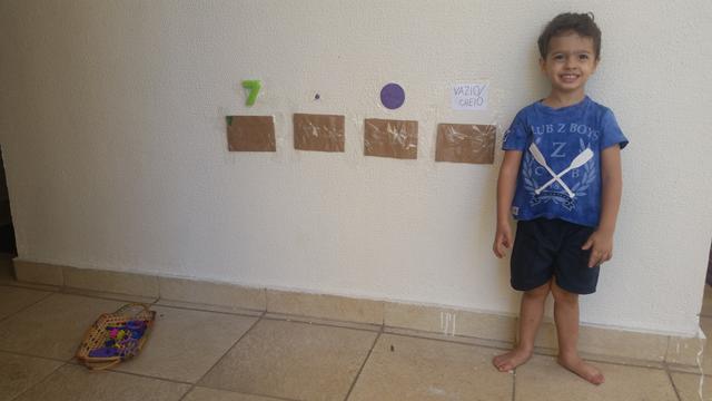 Hoje foi o dia de trabalhar o número 7, cor roxo, forma geométrica círculo e vazio/cheio com uma atividade bem lúdica. É muito simples, só utilizamos fita crepe e papelão.