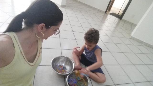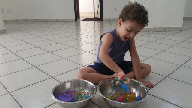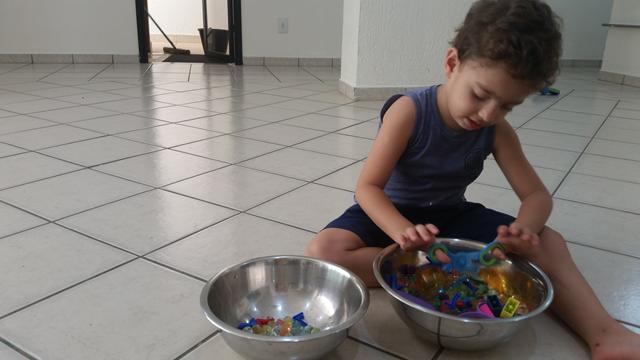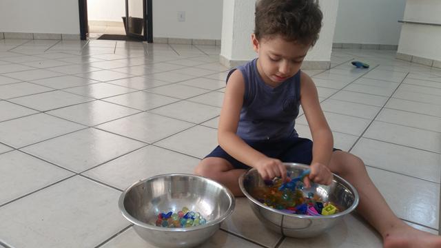 O objetivo desta atividade é caçar os números, cor roxo (pompom), forma geométrica círculo (papel EVA), vazio e cheio (pulseira/pulseira com lego) com o uso da tesoura bola.