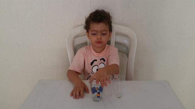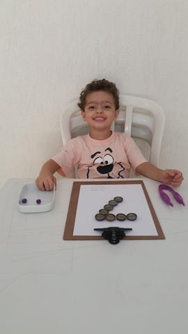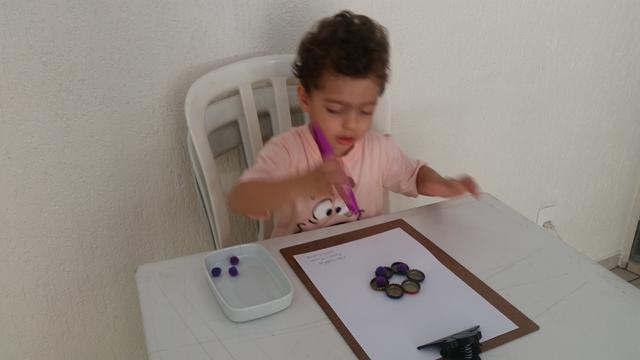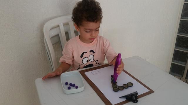 Montei o número 7 e forma geométrica círculo com tampinhas de cerveja. Davi Antonios fez transferência de pompons com pinça jumbo. Mamãe pediu para o Davi Antonios identificar qual é vazio (copo) e cheio (copo com animal). Uma ótima atividade que ajuda a trabalhar a coordenação motora fina, concentração, atenção e raciocínio.