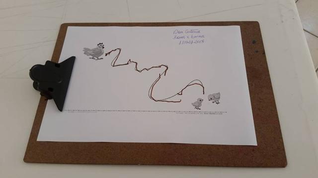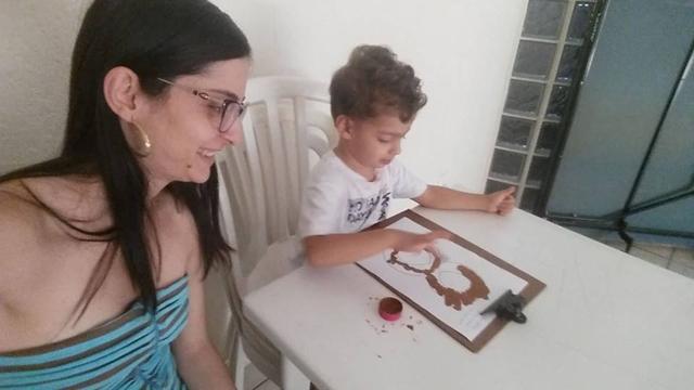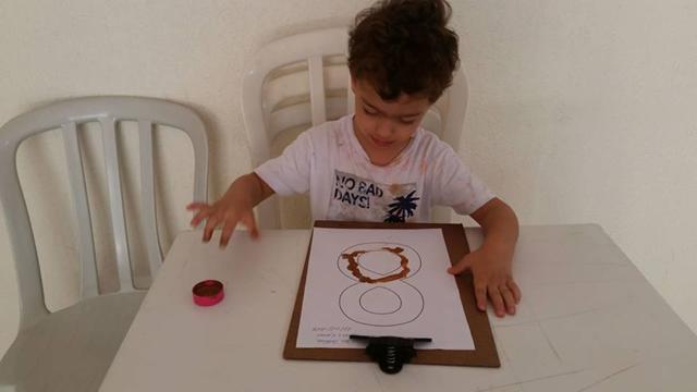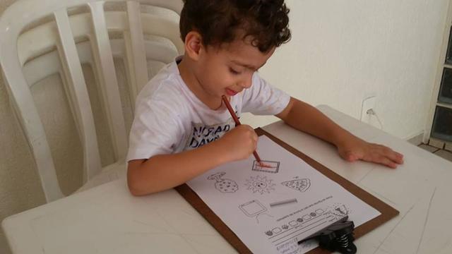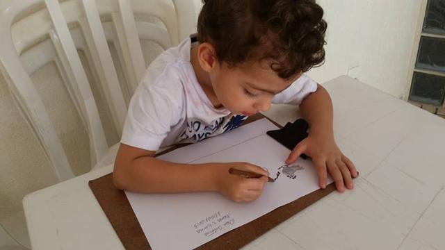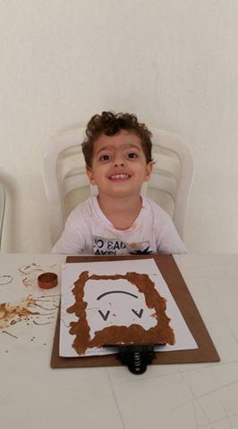 Davi Antonios utilizou vários materiais: lápis de cor, giz de cera, canetinha e tinta. Muito treino, paciência e muita coordenação!