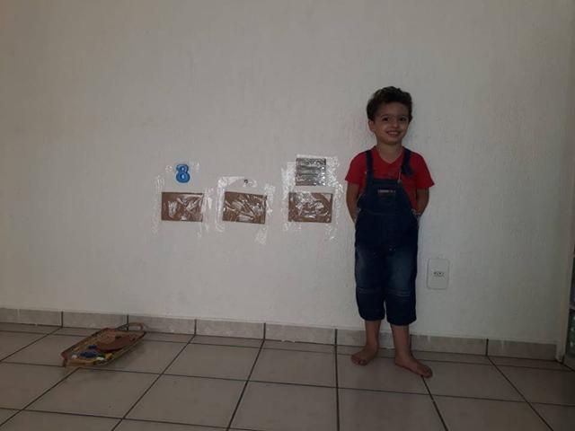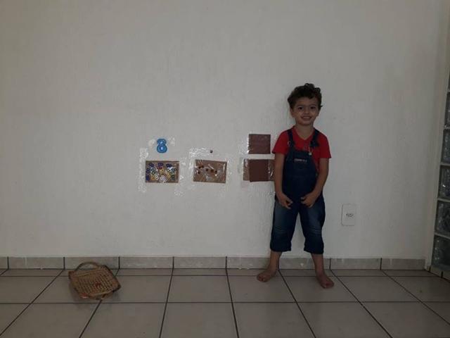 Hoje foi o dia de trabalhar o número 8, cor marrom, forma geométrica quadrado e rápido/devagar com uma atividade bem lúdica. É muito simples, só utilizamos fita crepe e papelão.