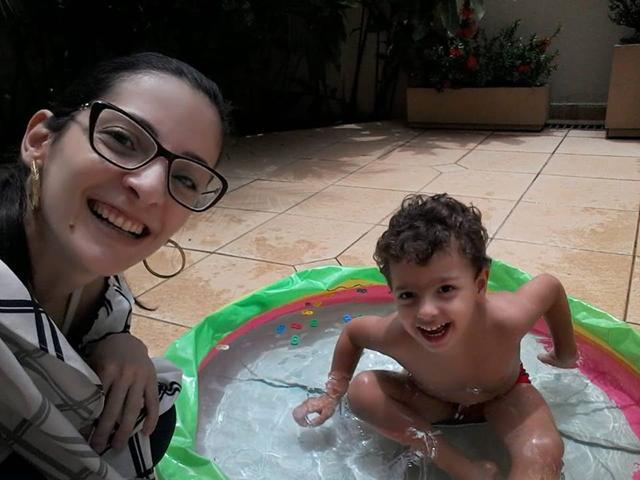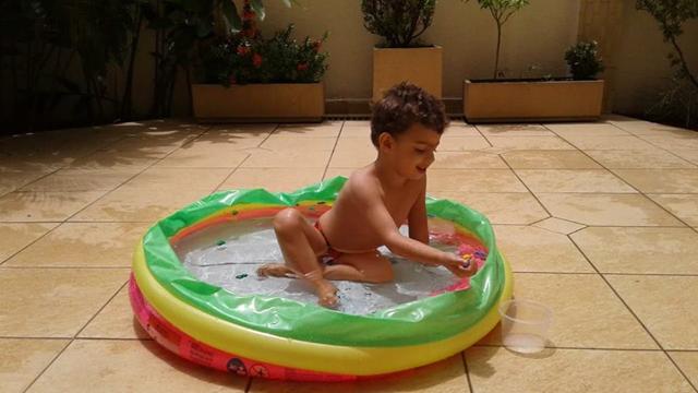 Tendo como objetivo o reconhecimento e ouvir a mamãe falar para procurar os números, cor marrom (pompom), forma geométrica quadrado (papel EVA) na piscina.