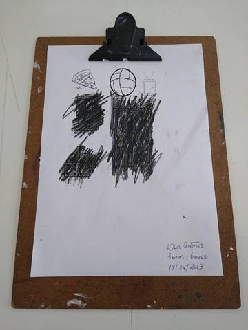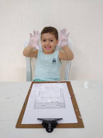 Davi Antonios utilizou vários materiais: lápis de cor, giz de cera, canetinha e tinta. Muito treino, paciência e muita coordenação!