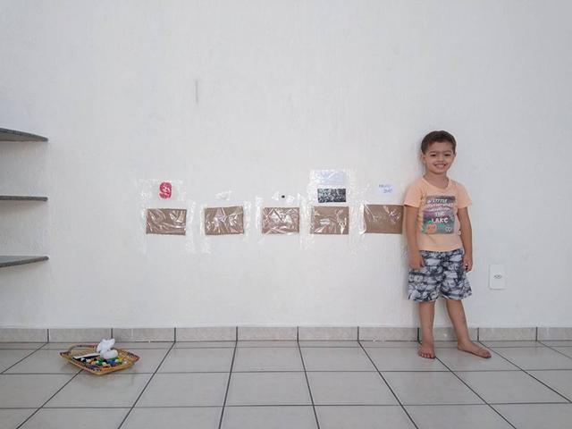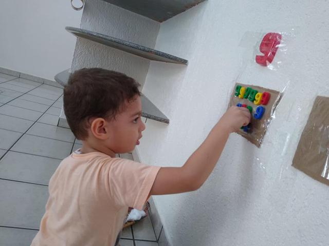 Hoje foi o dia de trabalhar o número 9, cor branco, cor preto, forma geométrica retângulo e macio/duro com uma atividade bem lúdica. É muito simples, só utilizamos fita crepe e papelão.