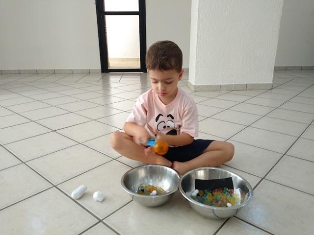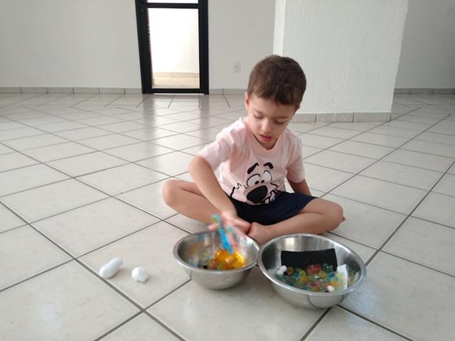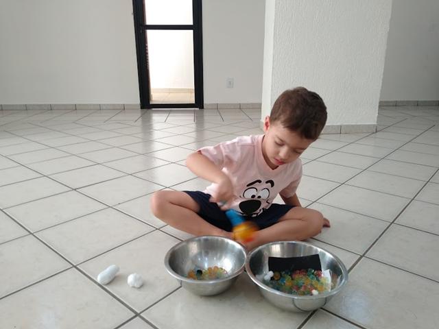 O objetivo desta atividade é caçar os números, cor branco (pompom), cor preto (pompom), forma geométrica retângulo (papel EVA) com o uso da tesoura bola e identificar o conceito macio/duro (algodão/pedra).