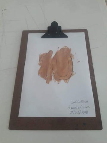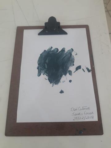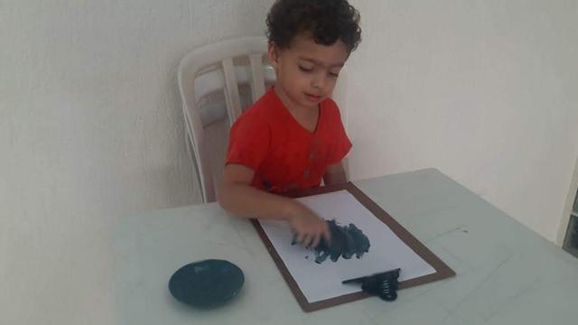 No vídeo, Davi estava pintando o coração no dedinho na cor cinza e disse: "Esse coração é da mamãe". (Estou dentro do coração da mamãe").