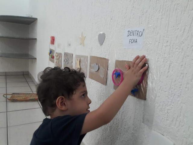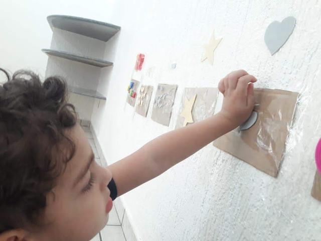 Hoje foi o dia de trabalhar o número 10, cor bege, cor cinza, formas geométricas estrela e coração e dentro/fora com uma atividade bem lúdica. É muito simples, só utilizamos fita crepe e papelão.