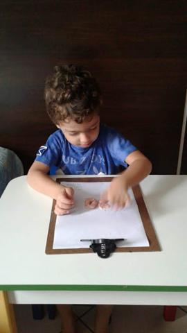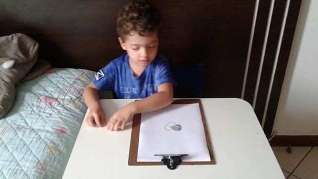 O primeiro objetivo desta atividade é o contorno do número 10 com massinha da cor bege, não pensei 2 vezes é lógico que Davi Antonios adorou e arrasou ?? Ele foi fazendo "cobrinhas" com a massa, e depois preenchendo as formas geométricas estrela e coração da cor cinza no papel. E o segundo objetivo: pedi para ele identificar o que é dentro e fora (pulseira com cachorro - o cachorro está dentro/fora da casa).