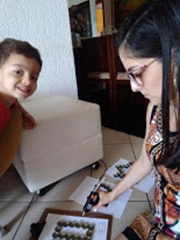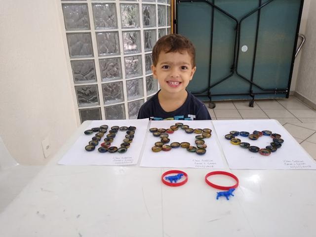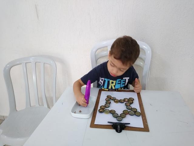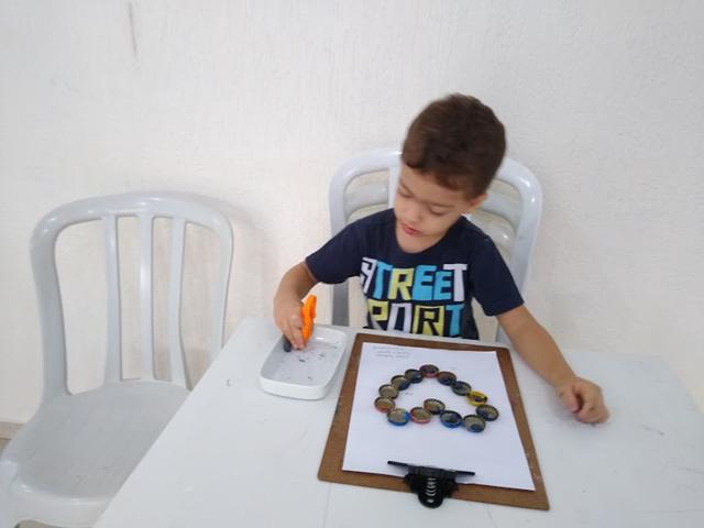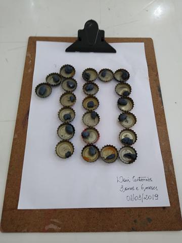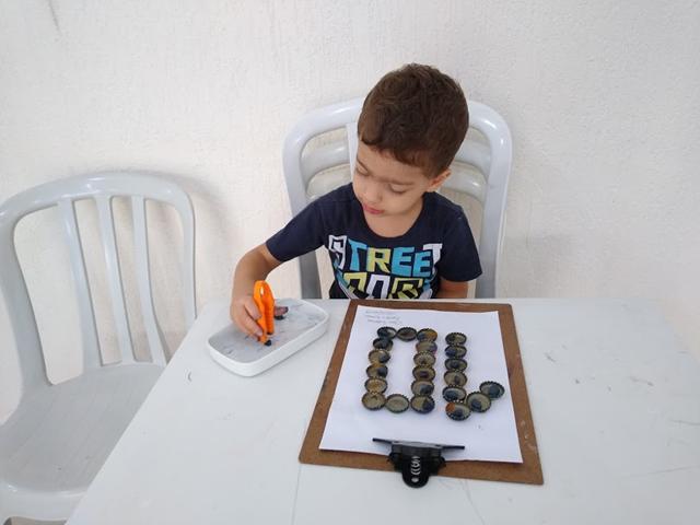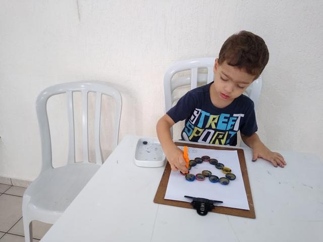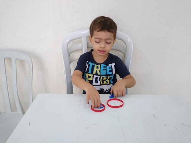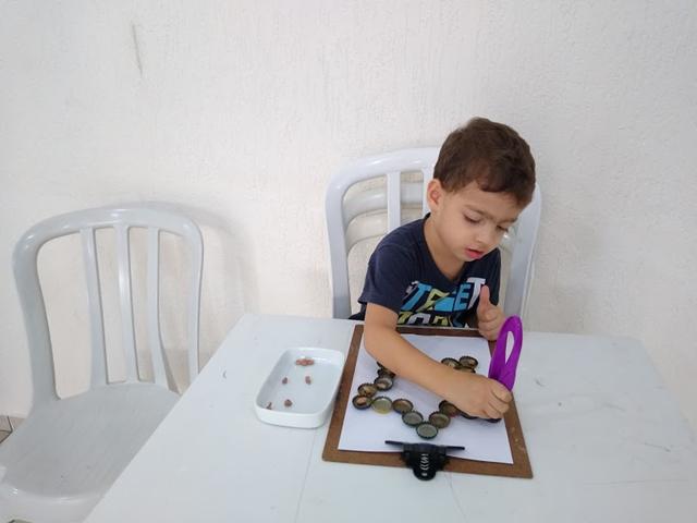 Esse algodão foi feito bem enrolado como bolinha e mistura de cores formando em bege (marrom+branco) e cinza (vermelho+verde+branco). Montei o número 10 e formas geométricas estrela e coração com tampinhas de cerveja. Davi Antonios fez transferência de algodão com pinça jacaré do número 10 e da forma geométrica coração da cor cinza e com pinça jumbo da forma geométrica estrela da cor bege. Mamãe pediu para o Davi Antonios identificar o que é dentro e fora (pulseira com cachorro - o cachorro está dentro/fora da casa).