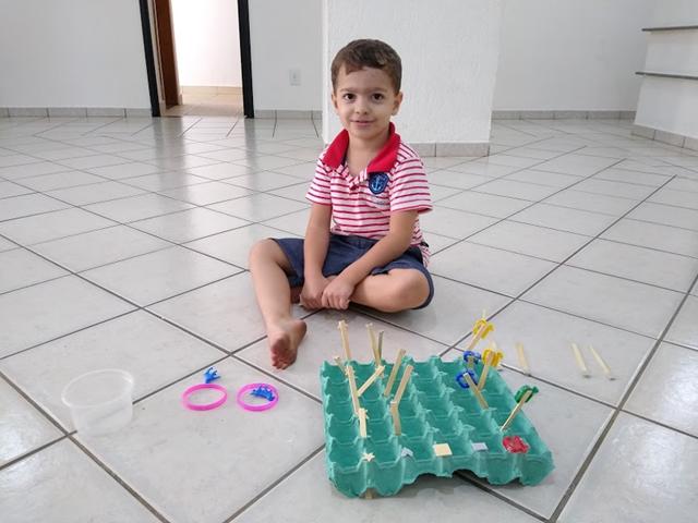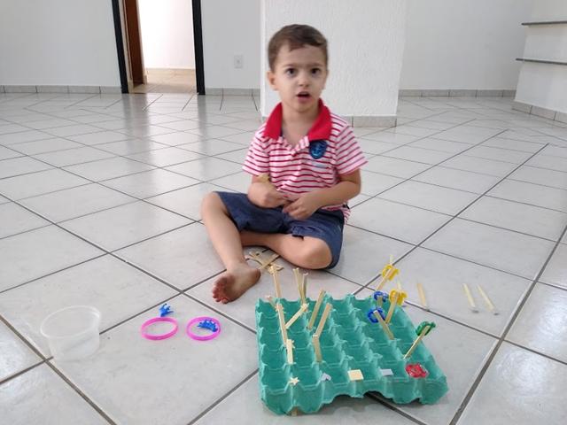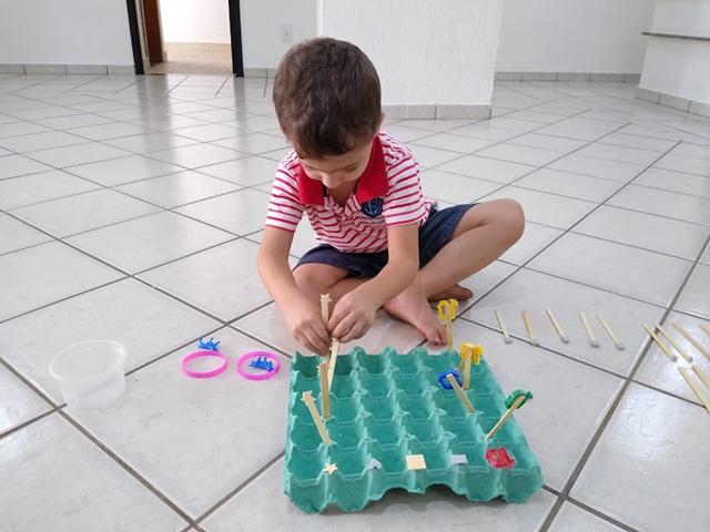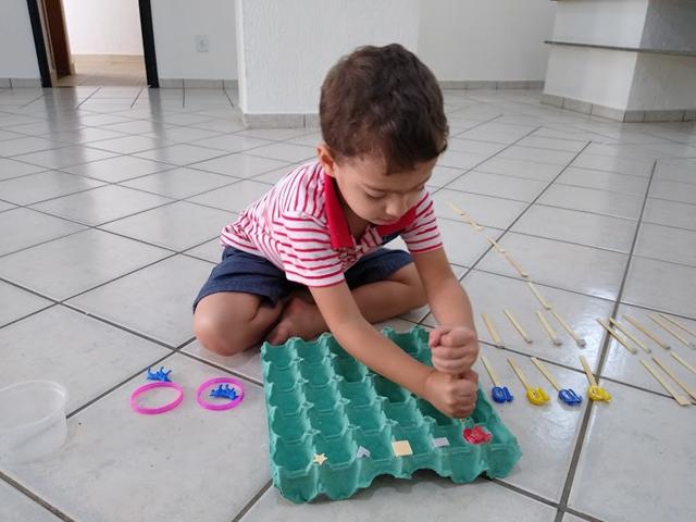 O objetivo desta atividade é furar a cartela de ovo para o Davi Antonios encaixar no lugar certo os números, cor bege (papel EVA), cor cinza (papel EVA) e formas geométricas estrela e coração (papel EVA) e identificar o que é dentro e fora (pulseira com cachorro - o cachorro está dentro/fora da casa).