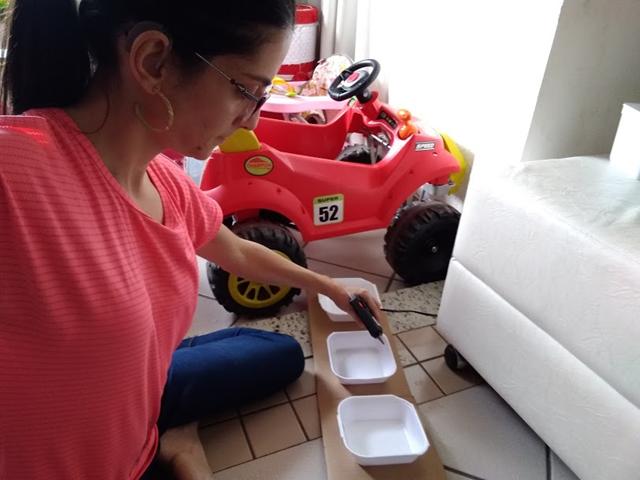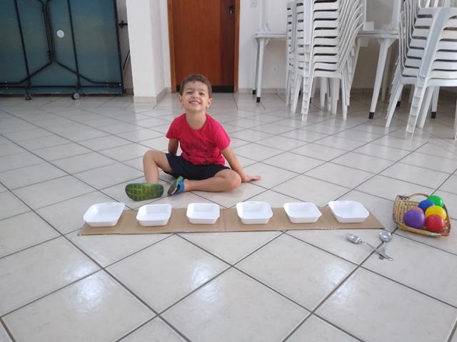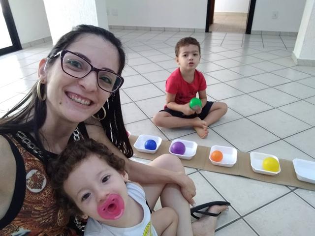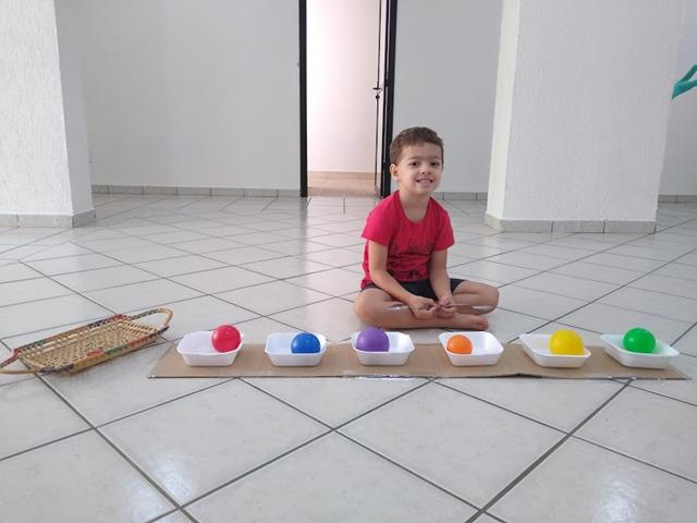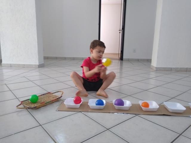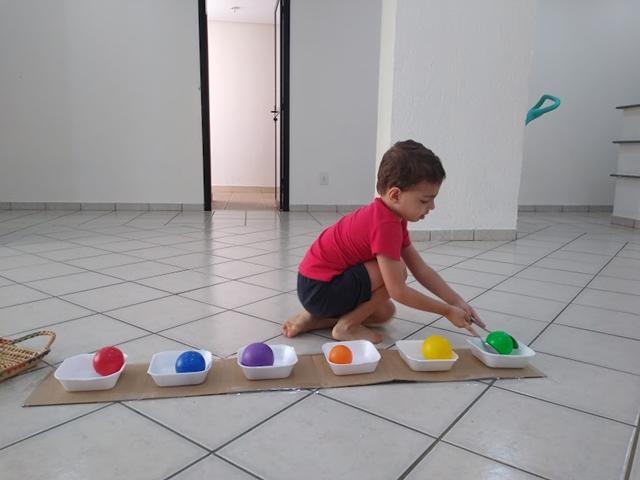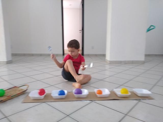 Filho, pega para a mamãe a bolinha da cor vermelha. Ele foi pegando a bolinha vermelha com duas colheres e colocando dentro da bandeja.